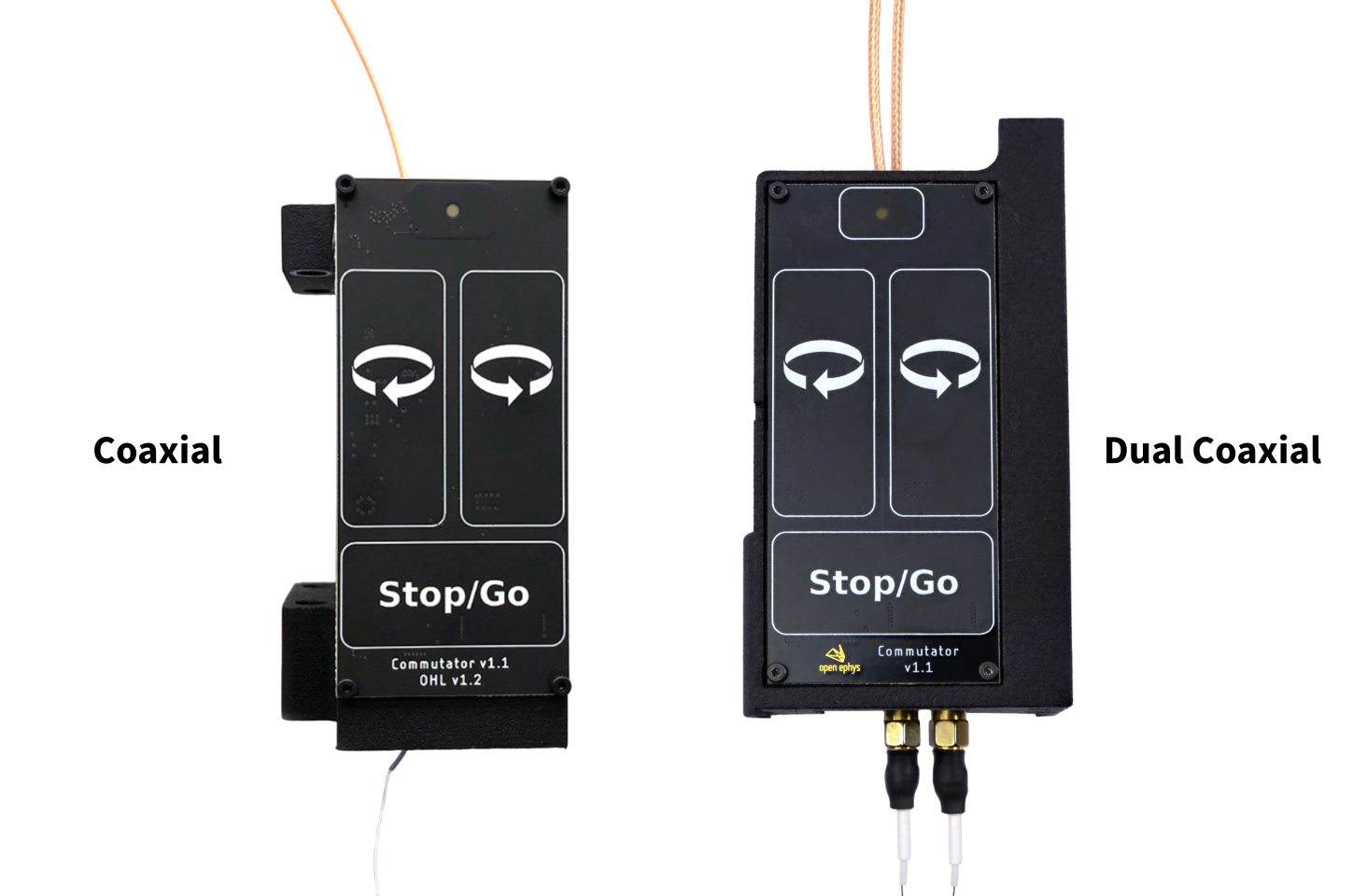 A dual-coaxial commutator is available to get data from two headstages at the same time, allowing researchers to combine, for example, two neuropixels headstages (1536 ch from four probes) or a miniscope and two neuropixels probes.