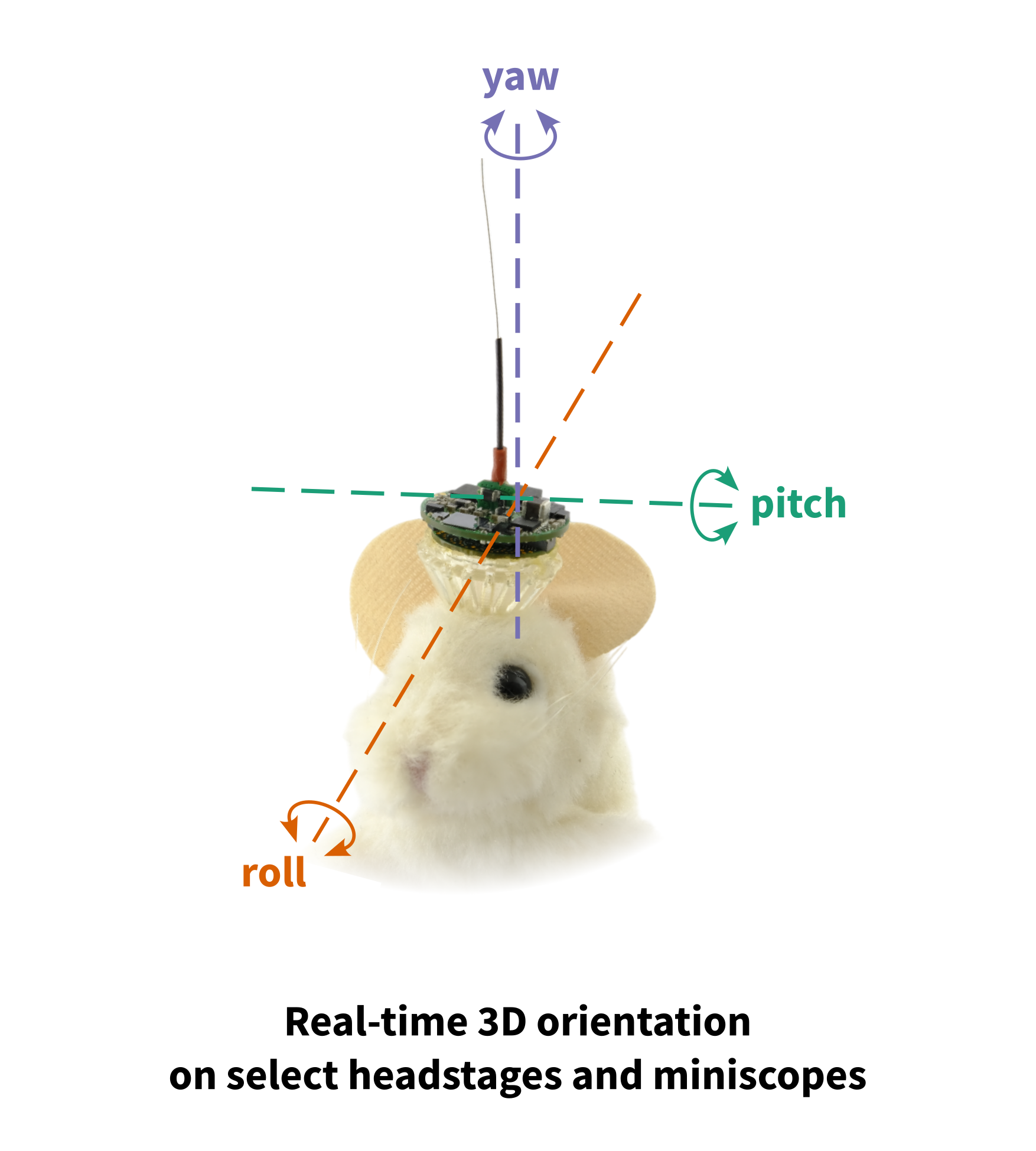ONIX headstages with an onboard 9-axis inertial measurement unit (IMU) can get high-resolution absolute orientation measurements (yaw, pitch, and roll) at the same time as neuronal recordings. Head orientation data can be used to characterize animal behavior, as well as to drive our torque-free commutators.