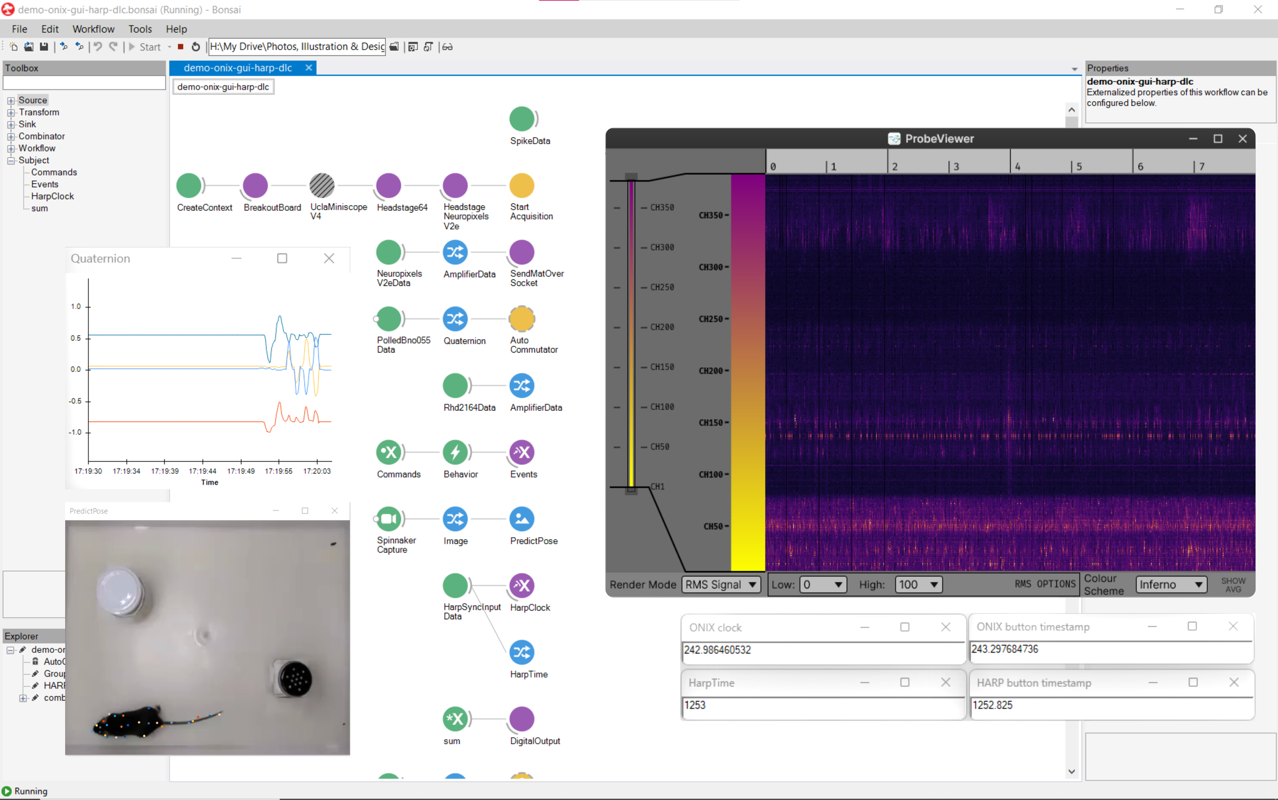 Running ONIX within Bonsai with the OpenEphys.Onix1 package enables acquisition of multiple ONIX data streams simultaneously with supported cameras and behavioral hardware. It is possible to achieve sub-ms closed-loop latencies including real-time processing in Bonsai. We provide example workflows to help you get started.